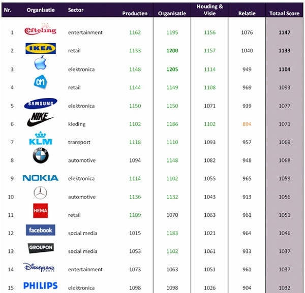 De Efteling wordt door Nederlanders als het meest inspirerende merk van Nederland gezien, gevolgd door IKEA, Apple, Albert Heijn en Samsung. Inspirerende merken onderscheiden zich door hun visie, track record, productinnovaties en producten. Merken met een positieve boodschap en tastbare proposities doen het goed. Merken blijven vooral gebruiksartikelen, relaties blijken moeilijk te bouwen. Dit blijkt uit de Inspirational Image Index ‘11 van Synergie, Stadspeil en MindWorld, onderzocht onder ruim 1.450 respondenten.