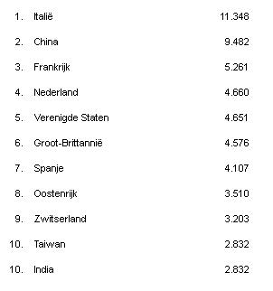 Als wordt gekeken naar het aantal beurzen waaraan is deelgenomen, dan leiden Oostenrijk en Zwitserland de ranglijst, met deelname aan 130 internationale beurzen. Daarna volgen Italië met 125 en Frankrijk en Groot-Brittannië met deelname aan 123 beurzen.