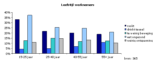 Naast verzuim, registreert 365 de gegevens van Preventief Medische Onderzoeken naar de gezondheid en leefstijl van werknemers. Daarin valt op dat schoolverlaters die de arbeidsmarkt betreden meer roken (33%) en vaker ongezond eten (37%) dan 25-plussers (zie grafiek). Juist omdat het gaat om door werknemers zelf gerapporteerde leefgewoontes, is het zorgelijk dat zij opvallend meer roken en vaker ongezond eten dan andere werknemers. In de leeftijdscategorieën 25-40, 40-55 en 55+ is het beeld van leefgewoontes ongeveer gelijk, waarbij opvalt dat alcoholgebruik over de jaren geleidelijk toeneemt van 4,4% onder 15-25 jarigen naar 10,8% bij 55-plussers. Het advies richting werkgevers is dan ook, om bij de jongste werknemers met name aandacht te besteden aan rookgedrag en werknemers van alle leeftijden te wijzen op het belang van gezonde voeding. Bij oudere werknemers kan het gebruik van alcohol een aandachtspunt zijn. “Maar ook bij jongere werknemers, want we weten dat er sprake is van onderrapportage in Preventief Medische Onderzoeken als het gaat om net nuttigen van alcohol”, tekent Roelen daarbij aan. Werkgevers kunnen zich met dedicated leefstijlprogramma’s hierop focussen.