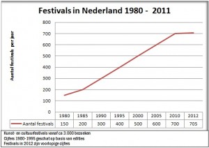 De afgelopen 30 jaar is het aantal festivals in Nederland vervijfvoudigd. Na het Holland Pop Festival in Kralingen in 1970 – het eerste muziekfestival dat buiten plaatsvond – is het snel gegaan. De grootste groei vond plaats tussen 1985 en 1995, toen het aanbod verdubbelde, maar in de periode tussen 1995 en 2005 nam de festivalmarkt met nog eens 50% toe. In 2010 werd het aantal van 700 festivals bereikt, gemiddeld bijna twee festivals per dag, iedere dag!
