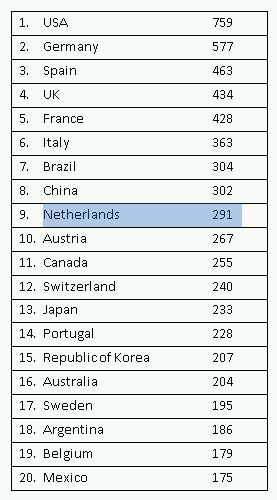 Nieuwkomer naar Nederland in de top tien is Oostenrijk, dat in 2010 nog op de veertiende positie stond.