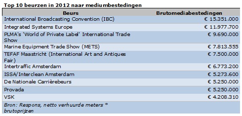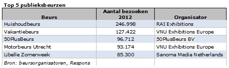 De grootste vak- en publieksbeurzen in 2012 naar aantal bezoeken zagen er als volgt uit:
