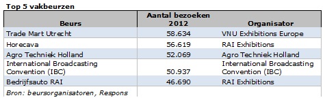 De 562 beurzen trokken in 2012 ruim 6,6 miljoen bezoeken, gemiddeld bijna 12.000 bezoeken per beurs. Daarmee nam het aantal beurzen voor eerst in vier jaar weer toe (+12%). Deze stijging kwam op het conto van de regionale vakbeurzen (+ 20%). Opmerkelijk daarbij is dat het aantal nationale vak- en publieksbeurzen steeg, maar in totaal minder bezoekers trok dan voorgaande jaren. De publieke belangstelling voor beurzen liep in 2012 met 2% terug, vergeleken met het jaar daarvoor.