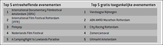 Op het meetonderdeel 'bezoekaantal' scoren respectievelijk de Vierdaagse Nijmegen (gratis) en International Film Festival Rotterdam (entreeheffend) het hoogst. Gemeten naar aantal MBE's voeren de Vierdaagse Nijmegen (gratis) en het Nederlands Film Festival (entreeheffend) de ranglijsten aan.