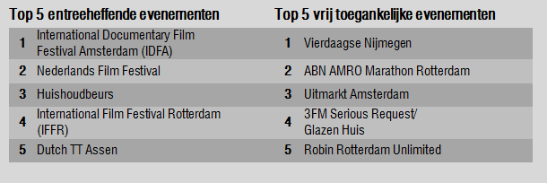 Op het meetonderdeel ‘bezoekaantal’ scoren respectievelijk de Vierdaagse Nijmegen (vrij toegankelijk) en International Film Festival Rotterdam (entreeheffend) het hoogst. Gemeten naar aantal MBE’s voeren 3FM Serious Request/Glazen Huis (gratis) en het Nederlands Film Festival (entreeheffend) de ranglijsten aan.