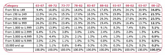 - Logischerwijs vormen de grotere congressen nu een kleiner aandeel. Alle congressen boven de 1000 deelnemers waren in 1963-1967 nog goed voor 29,7% van alle congressen, in 2008-2012 is het aandeel nog maar 8,1% van het totaal.