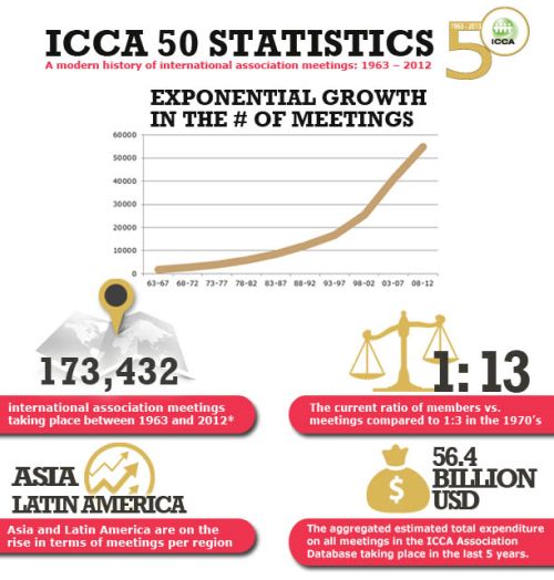 - ICCA begon in 1963 met 7 leden en kent er in 2012 inmiddels 917, wat maar weer eens aangeeft hoe belangrijk deze markt is en hoeveel partijen wereldwijd met associatie congressen bezig zijn.