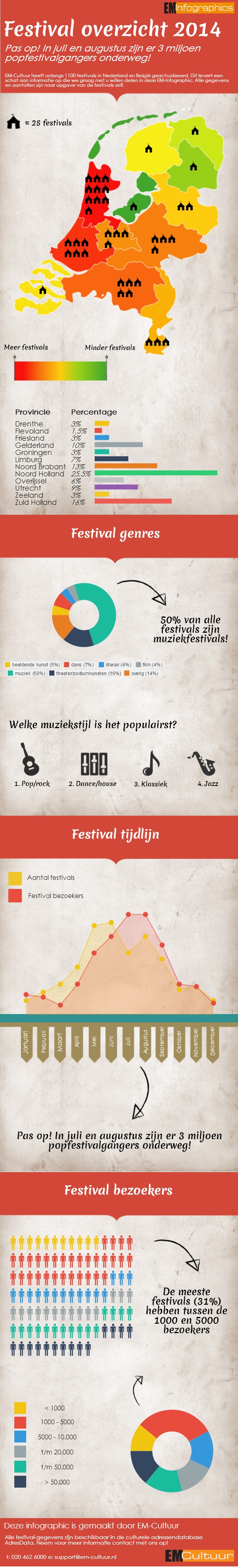 Het festivalseizoen is weer begonnen. Aanleiding voor EM-Cultuur om een een Infographic te maken waarin allerlei interessante feiten over meer van 1100 festivals aan het licht komen.