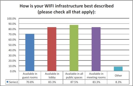 Cijfers uit het onderzoek geven weer dat 87,5 procent van de respondenten WiFi beschikbaar heeft in alle openbare ruimten, terwijl 70,8 procent WiFi beschikbaar stelt in alle kamers. Daarnaast biedt 70,8 procent deze dienst gratis in vergader-en de openbare ruimte, terwijl 60,9 procent gratis WiFi biedt in de kamers. Deze cijfers zullen alleen nog maar stijgen.