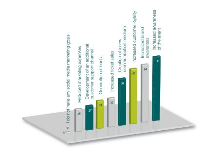 Het belangrijkste doel van social media marketing is meer bekendheid (awareness) geven aan de bijeenkomst en aan het merk/bedrijf die de deelnemers uitnodigt. Bijna 50% van de organisatoren van evenementen was in staat om dit te bereiken door middel van sociale media-activiteiten. De resultaten laten ook zien dat de doelstellingen behaald worden als er voldoende middelen beschikbaar worden gesteld. Ondanks het enorme potentieel, blijkt er nog steeds niet genoeg middelen beschikbaar te worden gesteld. Gebrek aan tijd en een tekort aan personele middelen blijven de grootste obstakels voor het bereiken van die doelen.