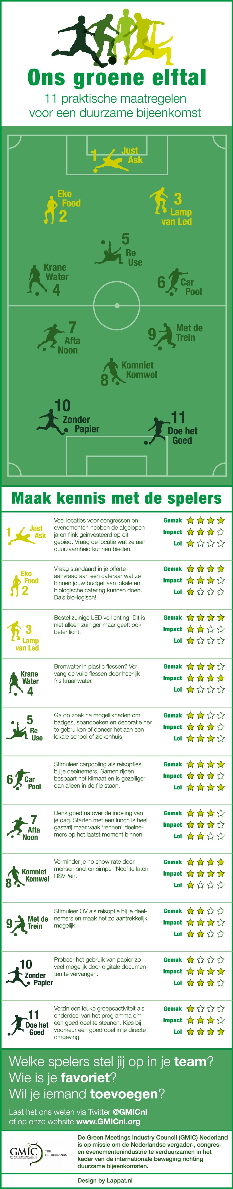 De Green Meetings Industry Council (GMIC) grijpt het wereldkampioenschap voetbal aan om duurzaamheid terug op de kaart te zetten. Zij lanceert in 2014 het Groene Elftal: elf spelers vertegenwoordigen ieder concrete, praktische tips die samen je duurzaamheidscore behoorlijk zullen verhogen.