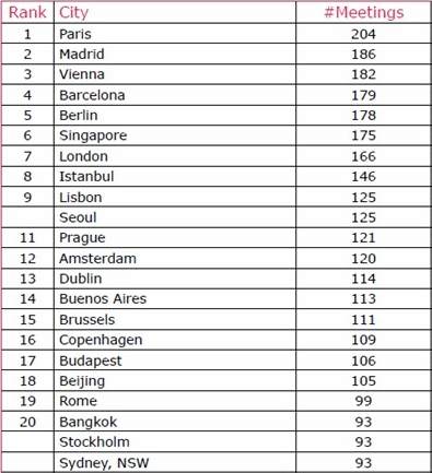 Op de stedenranglijst heeft Wenen de eerste plaats, die de stad sinds 2005 bezette, moeten afstaan aan Parijs (204 meetings, tegen 195 in 2012). Ook Madrid liet in 2013 Wenen achter zich op basis van het aantal internationale associatie meetings. Kopenhagen maakte een forse duikeling van plaats 8 naar plaats 16, met 109 geregistreerde meetings in 2013, ten opzichte van 137 meetings in het voorgaande jaar. Amsterdam, vorige keer tiende, staat nu op plaats 12, maar met slechts 2 congressen minder dan in 2012.