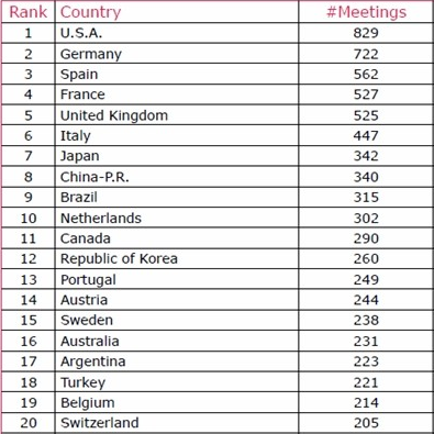 Duitsland blijft nog wel tweede op de ranglijst, na de Verenigde Staten. China is in het landenklassement over Nederland en Brazilië gehopt. Nederland was in 2013 het tiende internationale congresland met 302 internationale meetings, ten opzichte van 315 in 2012.