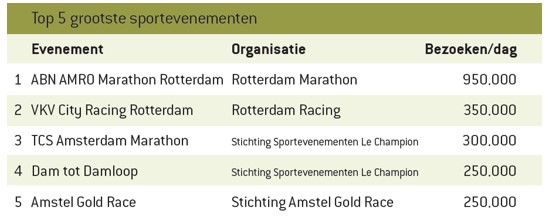Het grootste sportevenement in 2013 -op basis van aantal bezoeken per dag- was ABN AMRO Marathon Rotterdam met 950.000 bezoeken. Het bezoeken van sportevenementen is in Nederland populair: per jaar bezoeken vier op de tien volwassen Nederlanders wel eens live een sportevenement als deelnemer of als toeschouwer, zo blijkt uit het rapport van het Mulier Instituut.