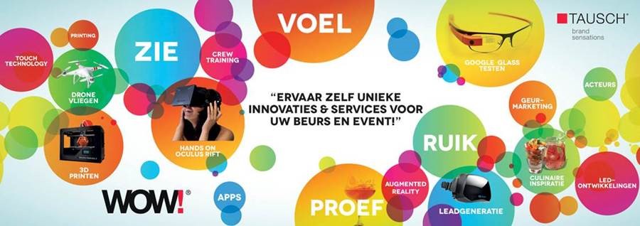 Op donderdag 27 november aanstaande organiseert Tausch brand sensations het 'WOW! Inspiratie event'. Een event waarbij het gaat om inspiratie en innovatie met betrekking tot live communicatie. Samen met een 20-tal partners uit de live-communicatie creëert Tausch een platform waar marketing en communicatieprofessionals allerlei vernieuwende ideeën, producten of diensten kunnen zien, horen, voelen, proeven en ruiken. Zo kunnen zij de Google Glass testen, 3D printen, zien hoe een drone vliegt, luisteren/voelen met de touch-dj en nog veel meer.
