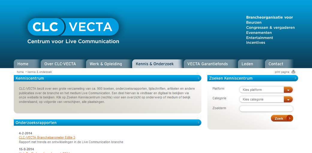 In het online kenniscentrum kun je documentatie zoeken op medium, categorie (Cijfers & Feiten, Trends & Ontwikkelingen en ROI & Tools) of door middel van een zoekterm. De documentatie bestaat uit eigen content van CLC-VECTA, zoals de Waardemodellen en jaarlijkse Beurscijferrapporten, gedeeltelijk enkel toegankelijk voor leden, maar ook rapporten van collega vak- en beroepsverenigingen, literatuurverwijzingen en andere relevante publicaties.