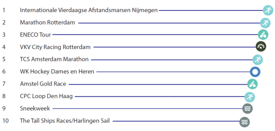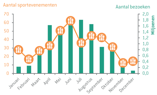 De 400 belangrijkste top- en breedtesportevenementen die in 2014 in Nederland hebben plaatsgevonden, trokken gezamenlijk 11,6 miljoen bezoeken, een half miljoen meer dan in 2013. Gezamenlijk genereerden de 400 sportevenementen een omzet van € 290 miljoen, eveneens fors meer dan in 2013. Ongeveer 60% van dat bedrag is afkomstig van bezoekers en deelnemers, de rest wordt opgehoest door overheden en bedrijfsleven.