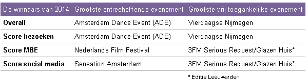 Met respectievelijk 350.000 en 2,24 miljoen bezoeken, behalen het ADE en de Vierdaagse de hoogste score op het aspect bezoekaantal. Het Nederlands Film Festival en het 3FM Serious Request/Glazen Huis (editie 2013 te Leeuwarden) behalen de eerste plaats in de categorie ‘media-exposure’. Het Glazen Huis gaat op mediagebied met beide prijzen aan de haal, want ook op social media-vlak was het evenement ongenaakbaar. Bij de entreeheffende evenementen gaat de social media-titel - net als vorig jaar - naar ID&T’s Sensation.