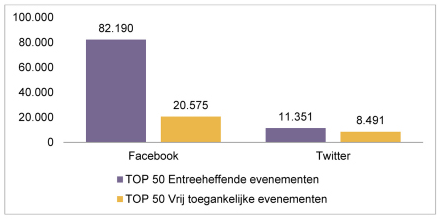 De populariteit van de social media platforms Facebook en Twitter is in de afgelopen jaren enorm toegenomen, ook bij de grootste evenementen van Nederland. Vooral bij entreeheffende evenementen is de groei explosief (+36% ten opzicht van het voorgaande jaar). Het aantal likes/volgers onder de vrij toegankelijke evenementen laat eveneens een sterke stijging zien (+24%), toch trekken vrij toegankelijke evenementen over het algemeen minder likes op Facebook.