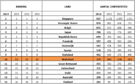 Het aantal internationale non-corporate congressen in Nederland is in 2014 gestegen van 293 naar 379. Hiermee stijgt Nederland 3 plekken en komt weer in de top 10 van de lijst van de Union of International Associations (UIA). UIA houdt jaarlijks het aantal internationale non-corporate (associatie- en gouvermentele) congressen bij.