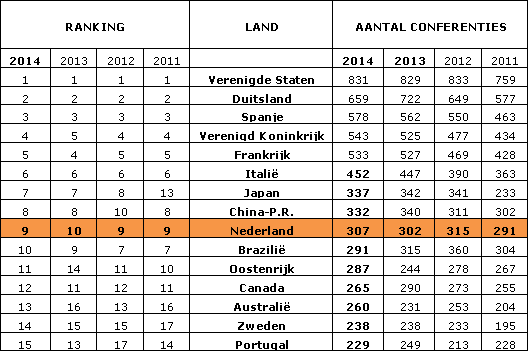 Nederland is een plek gestegen op de jaarlijkse ranglijst van The International Congress and Convention Association (ICCA) en staat in 2014 met 307 congressen op de negende plaats. In 2013 bekleedde Nederland de tiende plek met 302 internationale congressen.