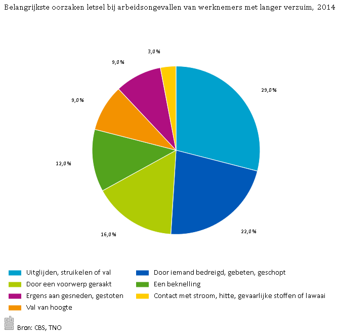 Onderuitgaan op de werkvloer was in 2014 de meest genoemde oorzaak van arbeidsongevallen die leidden tot een verzuim van vier dagen of meer. Dat blijkt uit enquêtecijfers van CBS. Ook letsel dat anderen toebrengen (bedreigen, bijten en schoppen) wordt vaak genoemd.