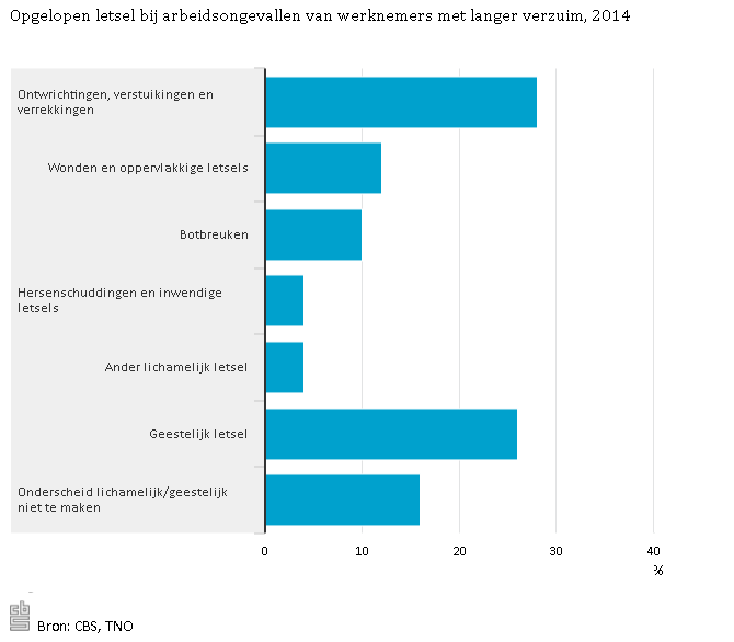 Bij ruim een kwart van de 88 duizend arbeidsongevallen die in 2014 leidden tot langer verzuim gaven de ondervraagden aan dat sprake was van geestelijk letsel (26%). Het gaat dan bijvoorbeeld om psychische schade door bedreiging of een shock door een traumatische ervaring. Bij 16% ging het om een combinatie van fysiek en psychisch letsel.