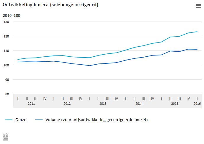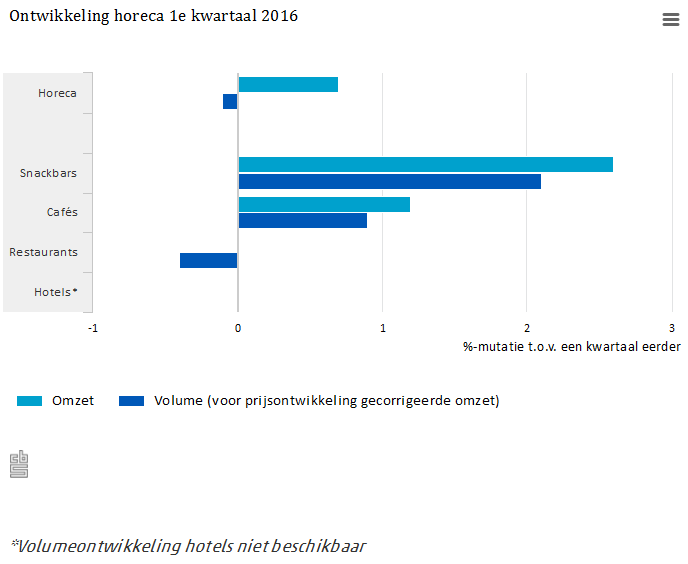 In het eerste kwartaal van 2016 hebben hotels, restaurants, snackbars en cafés 0,7 procent meer omgezet dan in het voorgaande kwartaal, meldt CBS. Dit is toe te schrijven aan gestegen prijzen. Het volume, het aantal consumpties en overnachtingen, daalde iets. Binnen de horeca steeg de omzet van snackbars het sterkst.