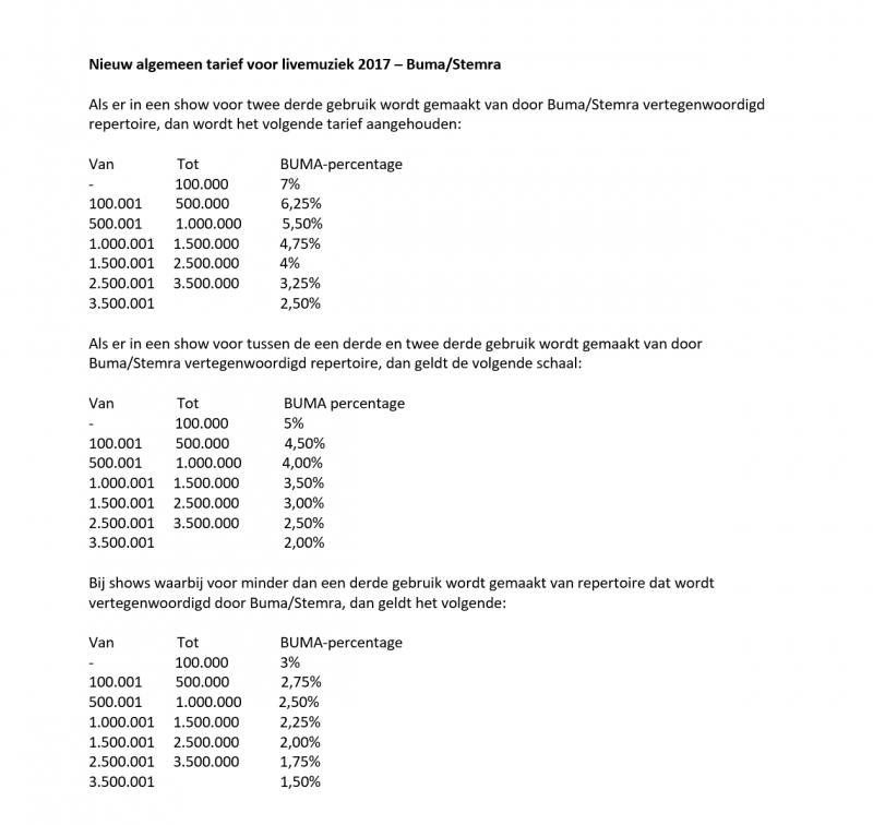 Het nieuwe tarief is tot stand gekomen in samenwerking met verschillende in de livemarkt actieve partijen en goedgekeurd door het College van Toezicht Auteursrechten (CvTA). Het gevolg hiervan is dat de huidige volumekortingsregeling vanaf 1 januari 2017 niet meer wordt gehanteerd.