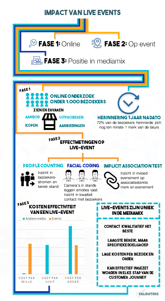 Sanoma zocht in samenwerking met Validators uit welke impact live-events hebben op merken, hoe een event en de merken in het geheugen blijven hangen en welke plaats een event inneemt in de mediamix. Om tot antwoorden te komen zijn drie onderzoeken, zowel online als op events zelf, uitgevoerd. Met onder andere camera’s in de stands, het meten van emoties en met het impliciete vaststellen van geheugenstructuren werd de waarde en kwaliteit van een evenement gemeten.