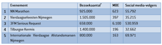In de top 5 vrij toegankelijke evenementen zijn wel verschillen. Zo is dit jaar besloten om de Vierdaagsefeesten Nijmegen en de Internationale Vierdaagse Afstandsmarsen Nijmegen apart in de lijst op te nemen. Dit heeft o.a. geleid tot een nieuwe nummer 1 in de ranglijst vrij toegankelijke evenementen.