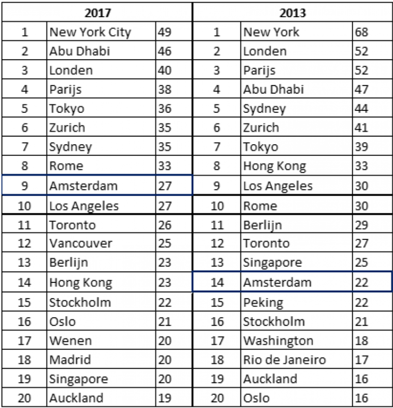 De top 5 bestaat dit jaar uit: New York (1), Abu Dhabi (2), Londen (3), Parijs (4) en Tokyo (5). Al deze steden hebben hun eigen unieke kwaliteiten; New York en Abu Dhabi zijn buitengewoon geliefd als zakelijk centrum, maar scoren lager als leefomgeving en toeristenstad. Parijs staat juist bovenaan als toeristenstad, maar scoort relatief laag als zakelijk centrum. Londen en Tokyo scoren ongeveer gelijk op alle drie de pijlers. De rest van de top 10 bestaat uit Zürich (6), Sydney (7), Rome (8), en Los Angeles (10). De laatste plaatsen op de lijst worden ingenomen door Lagos (58), Nairobi (59) en Teheran (60).