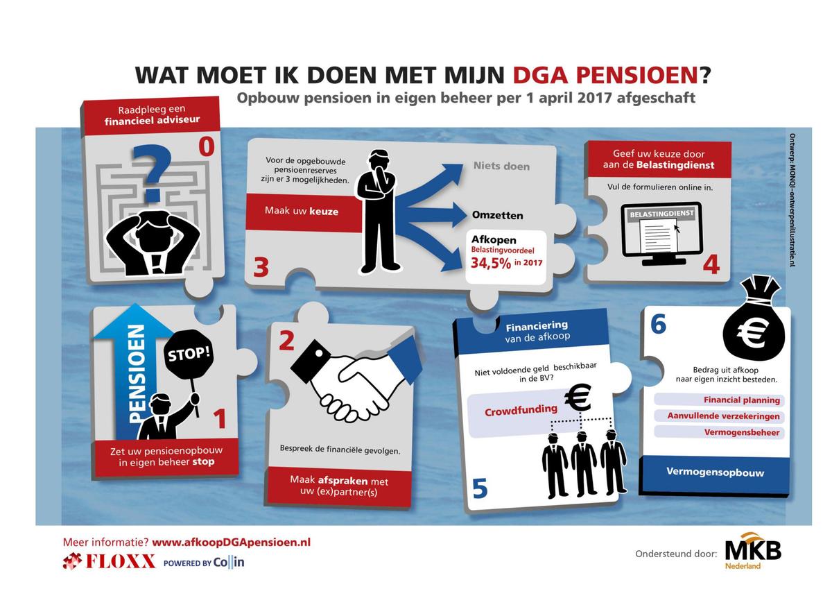 De opbouw van pensioen in eigen beheer wordt definitief stopgezet. De Eerste Kamer heeft dinsdag ingestemd met een wetsvoorstel van staatssecretaris Wiebes van Financiën voor uitfasering van het pensioen in eigen beheer van circa 150.000 dga's. De komende maanden zal MKB-Nederland samen met kennispartner 'FLOXX powered by Collin' en de aangesloten branches zoals Adfiz (financieel adviseurs) en SRA (accountants) ondernemers actief informeren over de mogelijkheden om het huidig pensioen af te kopen of om te zetten.
