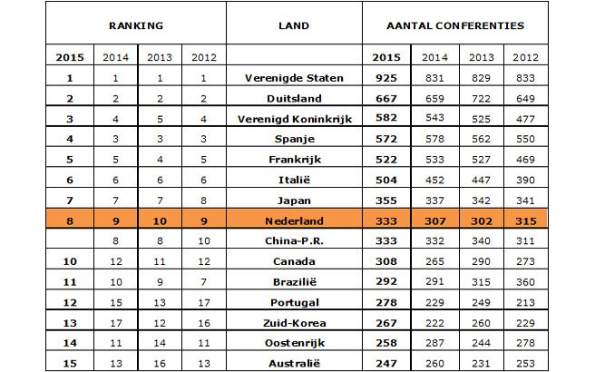 "Met de negende plek op de wereldwijde ranglijst, scoort Nederland sterk", aldus Eric Bakermans, Manager Meetings, Conventions & Events van NBTC Holland Marketing. "Voor NBTC is de positie binnen Europa wellicht nog belangrijker en wij zijn trots dat we daar onze zesde positie hebben weten te behouden. Dit toont aan dat onze jarenlange inspanningen op de internationale congresmarkt werken."