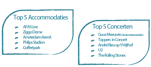 Verreweg de meeste concerten vinden plaats in de concertaccommodaties AFAS Live en Ziggo Dome. Bij de stadionconcerten trok Amsterdam ArenA de meeste bezoekers (380.066), gevolgd door het Philips Stadion in Eindhoven (met dank aan Guus Meeuwis) en de Arnhemse GelreDome. Bijna 80% van alle concerten 3.000+ bezoekers in Nederland vinden plaats in Amsterdam. De 199 grotere concerten vonden in totaal op 22 binnen- en buitenlocaties plaats.