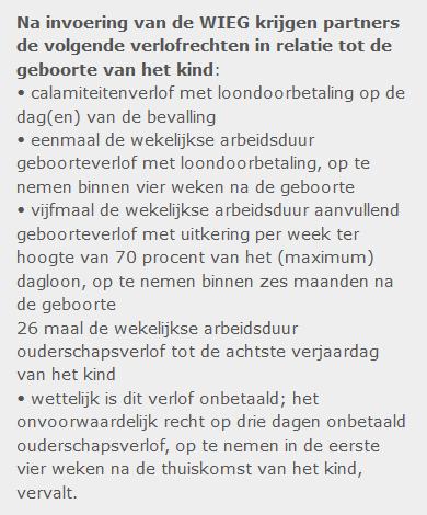 De Tweede Kamer heeft het wetsvoorstel voor extra geboorteverlof (WIEG) aangenomen. Vanaf 1 januari 2019 krijgen partners na de geboorte een hele week verlof volledig doorbetaald, in plaats van de twee dagen betaald kraamverlof waar zij nu nog recht op hebben. Partners kunnen het verlof meteen opnemen, maar mogen dat ook doen in de eerste vier weken na de bevalling.