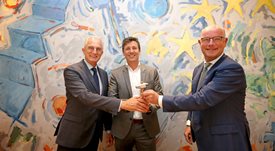 Foto: vice-voorzitters Fried Kaanen (links) en Jan Meerman (rechts) overhandigen de voorzittershamer aan Jacco Vonhof (midden).