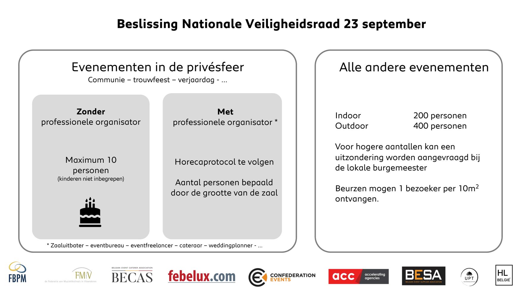 Volgens de beslissing van de Nationale Veiigheidsraad in België wordt voor maatregelen ten aanzien van bijeenkomsten een onderscheid gemaakt tussen privé-evenementen en professioneel georganiseerde evenementen: