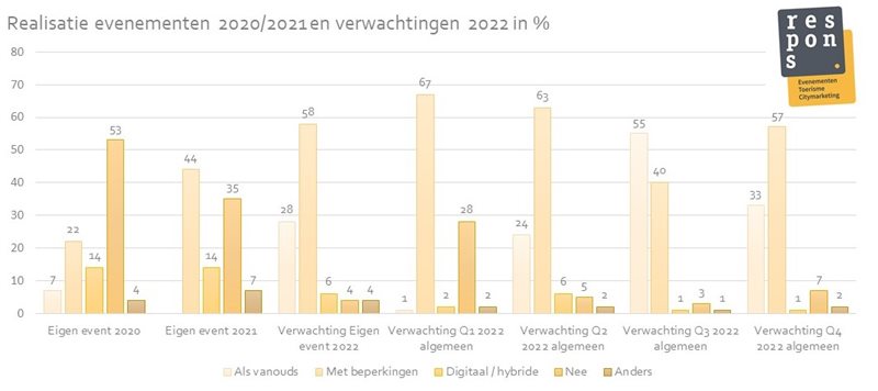 De evenementensector verwacht ook in 2022 nog het hele jaar met beperkingen te maken te hebben als gevolg van diverse corona maatregelen. Dat blijkt uit een recente quickscan binnen de totale branche waarvan onderzoeksbureau Respons vandaag de resultaten publiceert. Slechts 28% verwacht dat in 2022 hun zakelijke of publieksevenement kan worden georganiseerd zoals voor de pandemie. Ruim 60% rekent op beperkingen of een aangepaste vorm zoals online of hybride. Bekeken over het hele jaar zijn de vooruitzichten voor het 1e kwartaal dat er veel beperkingen zijn. In het 2e en 3e kwartaal is er een positiever beeld maar ruim de helft van de respondenten vreest dat de covid-19 malaise in het 4e kwartaal van 2022 weer de kop zal opsteken.