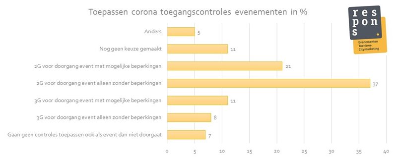 Uit de quickscan blijkt verder dat organisatoren bereid blijven om een corona toegangscontrole toe te passen als dat betekent dat het evenement daardoor kan doorgaan. 37% wil daarvoor zelfs de 2G controle toepassen. Meer dan 10% worstelt nog met de keuze voor 2G, 3G of geen controle.