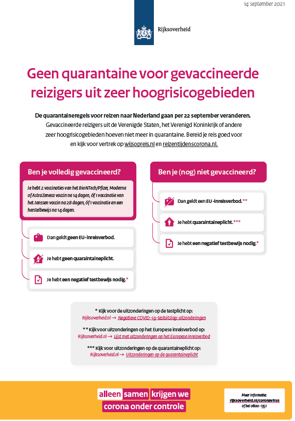 Gevaccineerde reizigers uit de Verenigde Staten, het Verenigd Koninkrijk of andere zeer hoogrisicogebieden hoeven dan niet meer in quarantaine.