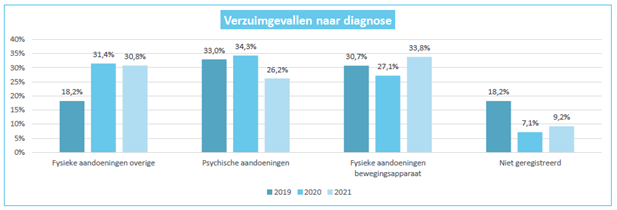 Het verzuim is grotendeels te wijten aan psychische aandoeningen alhoewel er een daling te zien is vergeleken met voorgaande jaren. Opvallend is de stijging in fysieke aandoeningen aan het bewegingsapparaat met verzuim als gevolg. Verzuim naar aanleiding van een bedrijfsongeval kent een daling in 2020 en 2021 wat gezien corona logisch is.