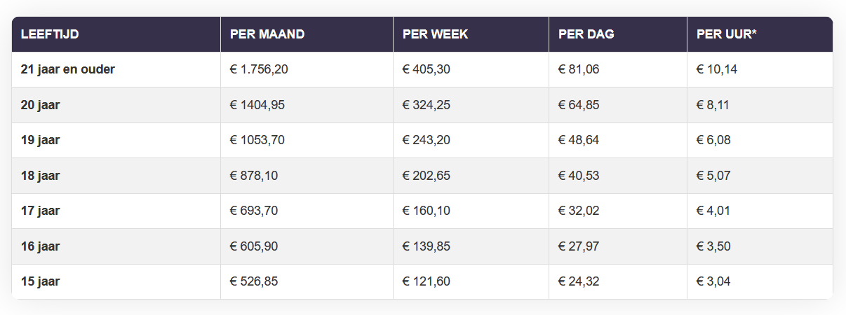 Een werknemer van 21 jaar en ouder heeft per 1 juli 2022 dus minimaal recht op een brutoloon van € 1756,20 per maand. Bij uitbetaling per week gaat het om een minimumbedrag van € 405,30. Uurtarieven zijn niet alleen afhankelijk van leeftijd, maar ook van de duur van een werkweek: