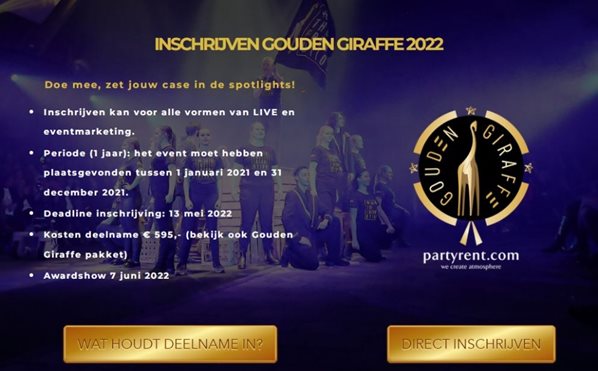 De inschrijving voor de Gouden Giraffe Event Awards 2022 is geopend. Wie organiseerde de meest impactvolle live communicatie en experience marketing van Nederland? Inschrijven kan tot en met 13 mei 2022 in zes categorieën. De prijzen worden uitgereikt op 7 juni bij AFAS Leusden, als afsluiting van de Week van LIVE Communicatie.