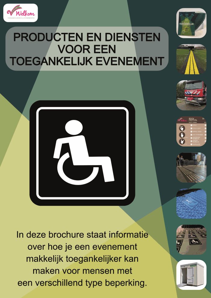 Hoe toegankelijk is jouw evenement? Iedereen die een evenement organiseert kan rekenen op de komst van mensen met een beperking. Veel organisatoren doen hun best om een evenement toegankelijk voor iedereen te maken. Zij vragen zich wel af: Wat hebben mensen met een beperking nu nodig en welke leveranciers kunnen we het beste inschakelen? Zomaar een rolstoeltoegankelijk toilet inboeken levert vaak niet (volledig) toegankelijke producten op. Hoe kun je voorkomen dat je ondanks al je goede intenties toch ontoegankelijke producten inhuurt? Wie zijn de leveranciers met wél toegankelijke producten? Het is soms zoeken naar een speld in een hooiberg maar daar is nu een einde aan gekomen. Toegankelijkheidsadviseur Marianne Dijkshoorn heeft een brochure ontwikkeld getiteld: ‘Producten en diensten voor een toegankelijk evenement’.