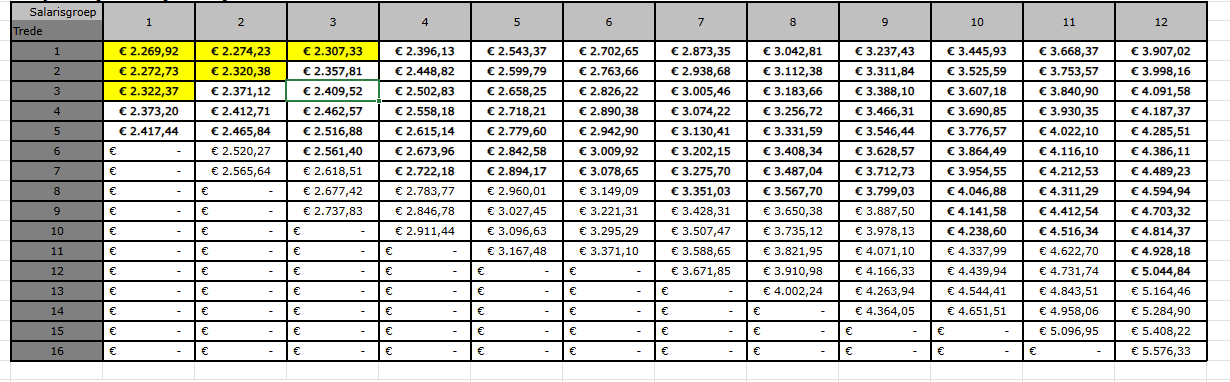 De verhoging per 1 januari heeft gevolgen voor onderstaande geel gemarkeerde functiegroepen en tredes in het loongebouw van de CAO TTB doordat zij onder het minimum van € 2.324,12 per maand uitkomen.