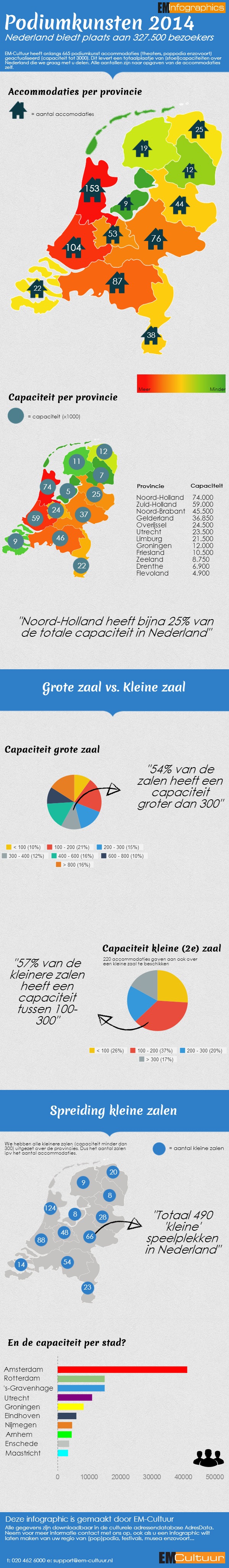 Jaarlijks maakt EM-Cultuur een infographic over podiumkunst-accommodaties. Voor 'Podiumkunst-accommodaties 2014' zijn 665 podiumkunst-accommodaties (theaters, poppodia etc.) geactualiseerd (capaciteit tot 3000). Dit levert een totaalplaatje van (stoel)capaciteiten over Nederland die wordt gevat in een infographic. Alle aantallen zijn naar opgave van de accommodaties zelf. Adressen, contactpersonen, capaciteit etc. zijn raadpleegbaar in de culturele adressendatabase AdresData.