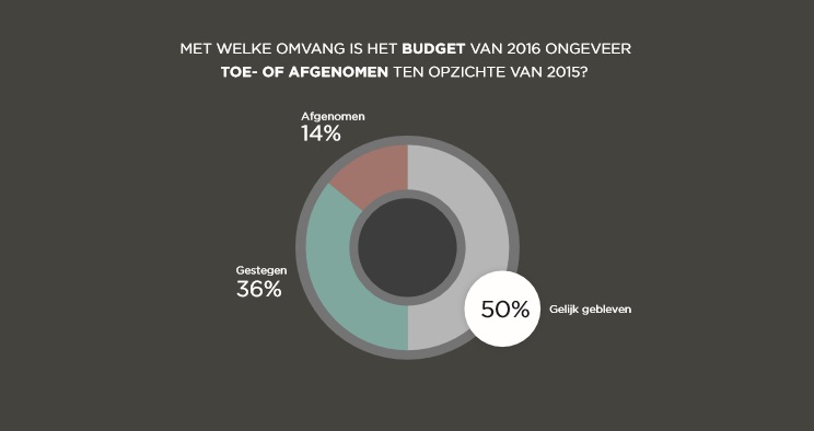 In 2012 zag bijna de helft van de opdrachtgevers hun evenementenbudget krimpen.Een heel kleine groep, 1 op 8, kreeg in dat jaar meer te besteden. Dat beeld is in 2016 volledig omgedraaid. Maar liefst 36 procent van de deelnemers aan het Locatieonderzoek geeft aan dat het budget het afgelopen jaar is gegroeid; slechts 14 procent moest budget inleveren.
