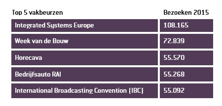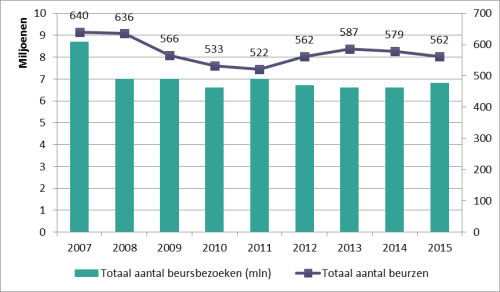 In 2014 hadden vakbeurzen al een moeilijk jaar achter de rug maar ook in 2015 zagen ze forse dalingen. De vakbeursbezoeken zijn met 2,6% afgenomen, het aantal vakbeurzen is gedaald met 10,4% en het aantal exposanten met bijna 10%. De daling is deels toe te rekenen aan het feit dat er in 2015 een aantal tweejaarlijkse vakbeurzen niet hebben plaatsgevonden. Maar er is nog een belangrijke reden voor de daling onder vakbeurzen en vakbeursbezoekers in 2015. Steeds meer vakbeurzen worden samengevoegd, waardoor er jaarlijks minder beurzen overblijven. Het samenvoegen van brancheverwante beurzen zorgt weliswaar voor voldoende publieke belangstelling voor de ‘beursboulevard’, maar in totaal leidt het tot een inkrimping in vergelijking met de jaren daarvoor. Het lijkt er echter op dat dit voor sommige vakbeurzen de enige manier is om te overleven.