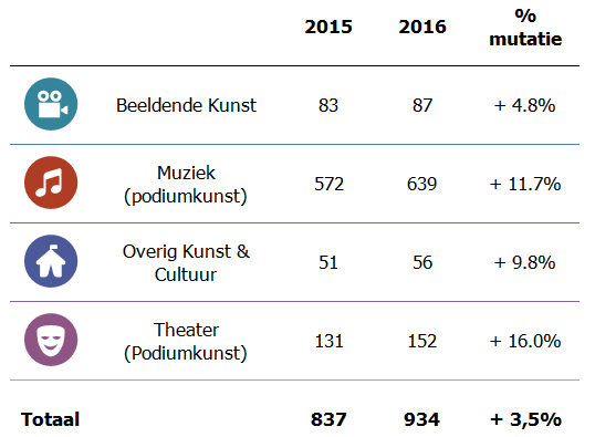 Bijna 70% van alle kunst- en cultuurfestivals in de Festival Monitor zijn muziekfestivals. EDM en popfestivals zijn binnen de muziek de grootste genres. Het aantal muziekfestivals neemt in 2016 met bijna 12% toe ten opzichte van 2015. Met een groei van 16% groeit de categorie theater naar verhouding het hardst. Theaterfestivals zien de publieke belangstelling met 3,3% stijgen naar 4,3 miljoen bezoeken. Beeldende kunstfestivals laten in 2016 de grootste stijging zien in bezoekaantallen (+27,2%). In totaal geven de bezoekers van de 934 kunst- en cultuurfestivals € 865,3 miljoen uit aan o.a. tickets, eten & drinken en producten/merchandising in 2016. De hoogste bestedingen worden gerealiseerd bij muziekfestivals: € 651,7 miljoen, 75% van de totale bestedingen van festivalbezoekers.